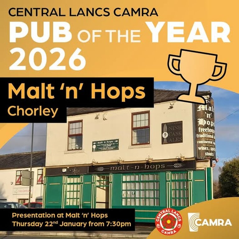 Well the judging is over and it can now be revealed that the Malt 'n' Hops in Chorley is the branch's Pub of the Year for 2026. Having been the Runner-Up in each of the previous three years, it is an award that is long overdue for this popular pub near the railway station. Incidentally the Runner-Up on this occasion was the Winckley Street Ale House in Preston, a pub that was also the branch's Pub of the Season as recently as Autumn 2025.